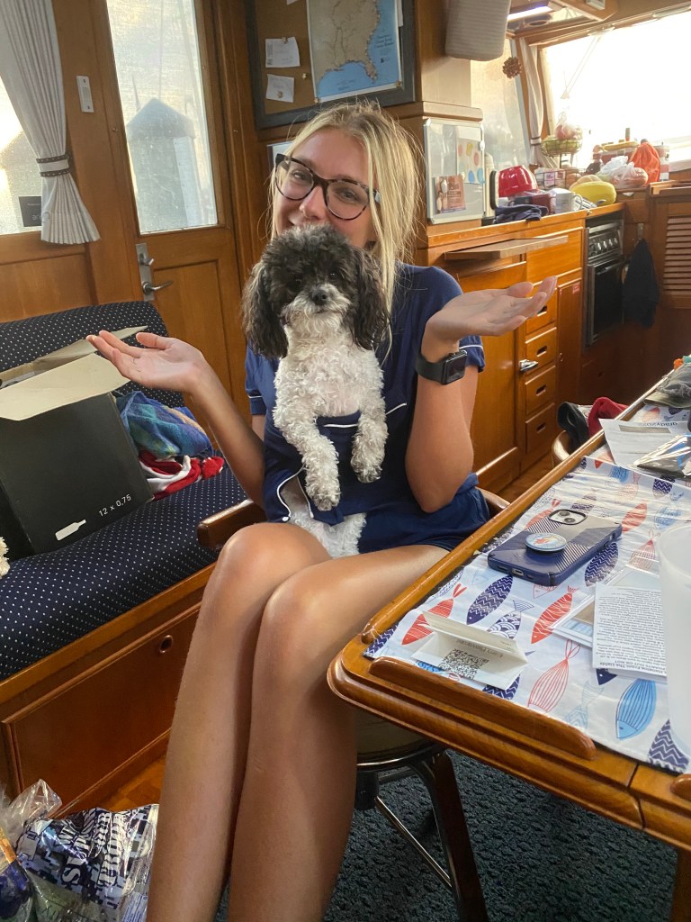 When we went to check in we were given a bag of goodies, including pineapple juice and baby bottles of Malibu… Yum! Along with meet the marina cat and dog, both super sweet and friendly.