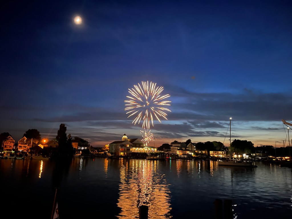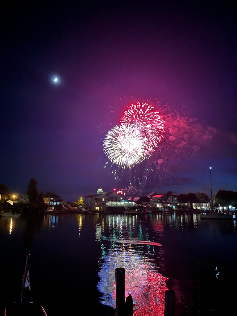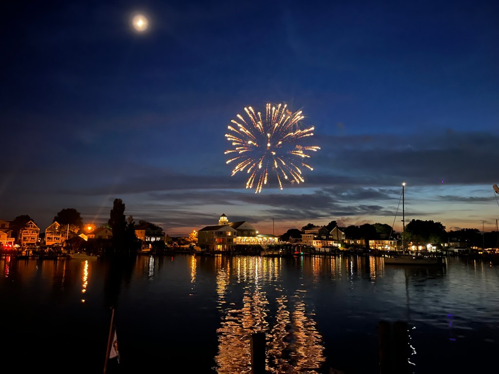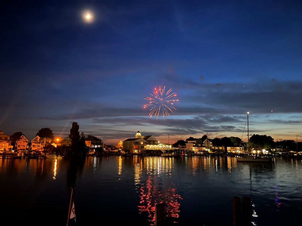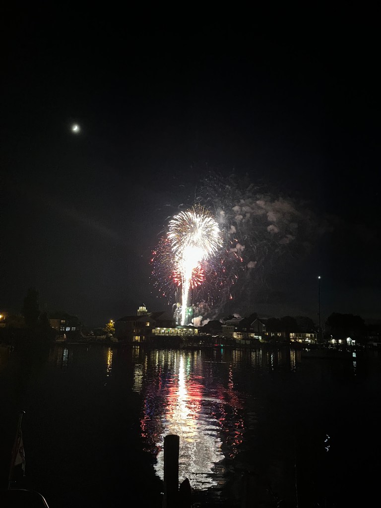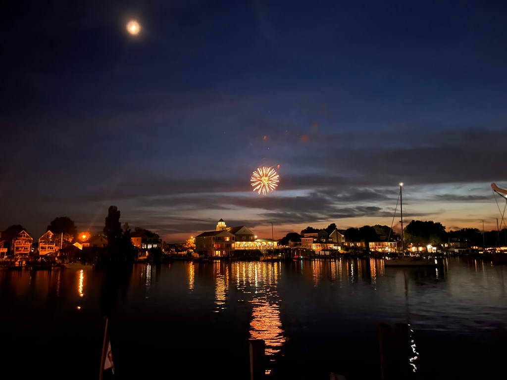 For dinner, we cooked burgers on the grill in our flybridge with Silver Linings and enjoyed their company. At dark, Solomons fireworks did not disappoint. Jen took some beautiful firework pictures. And of course we had our annual cherry pit spitting contest. The Silver Linings crew did great 🙂