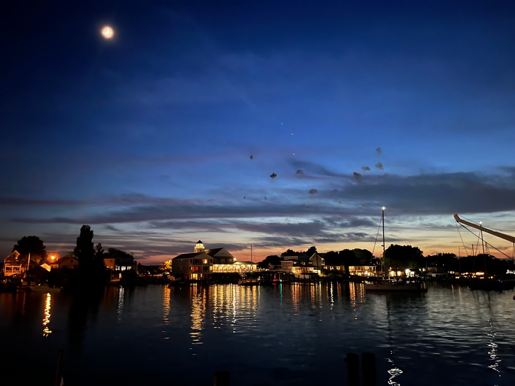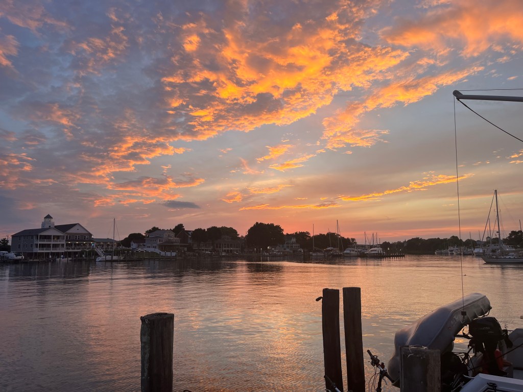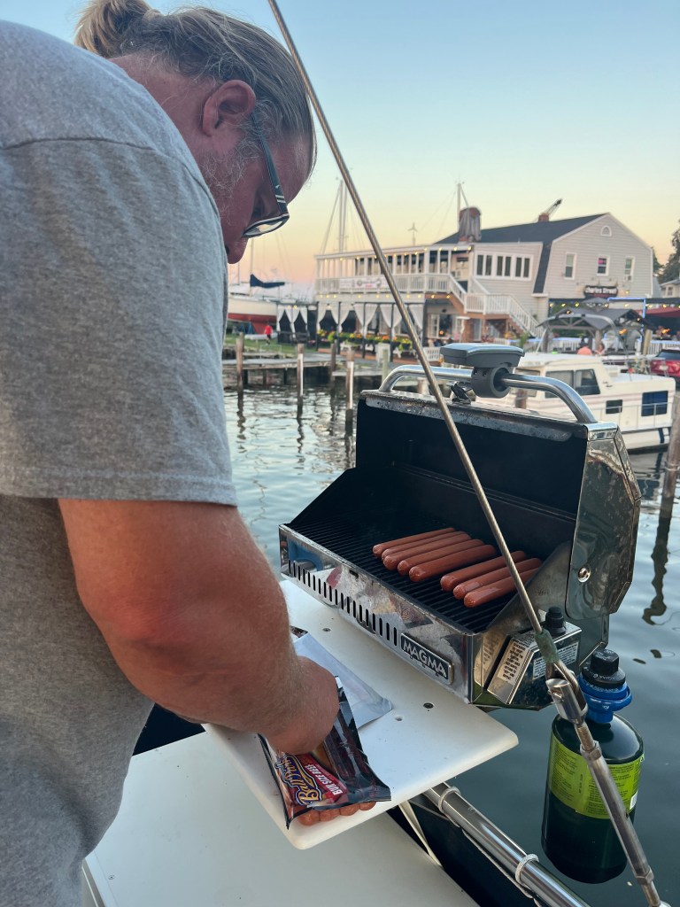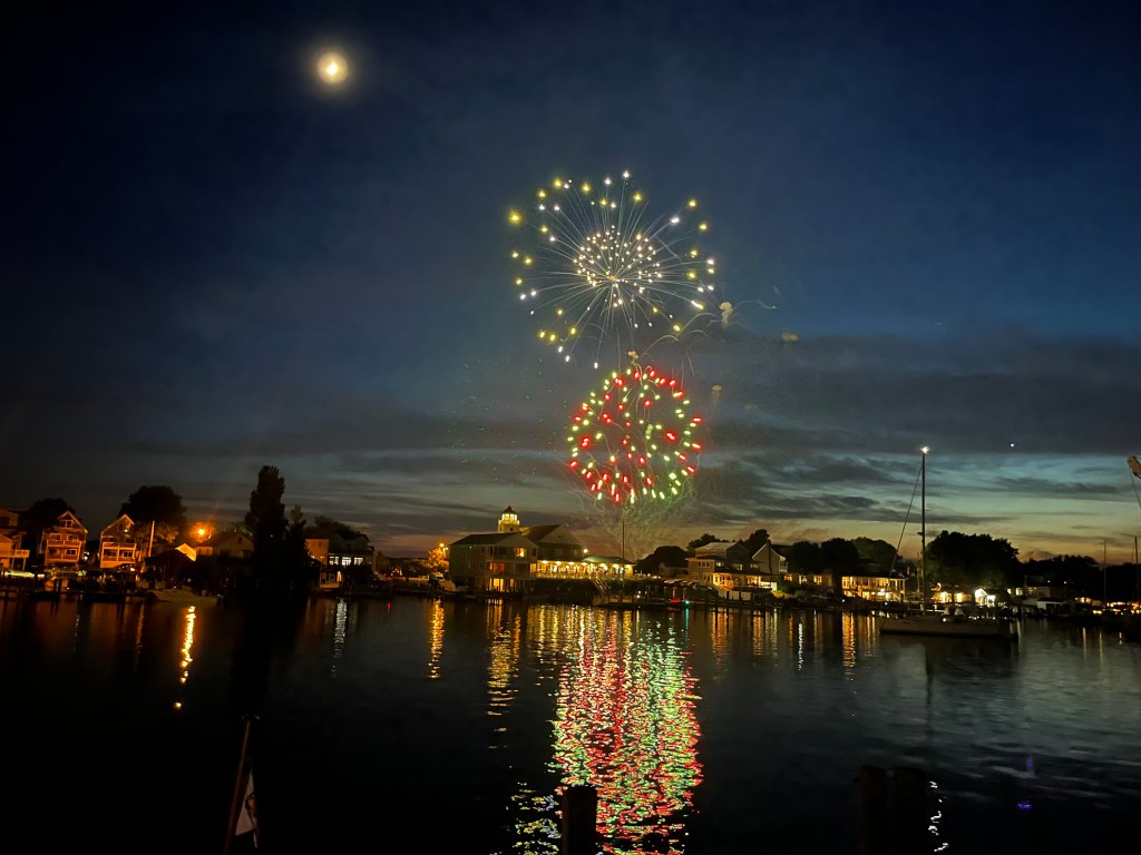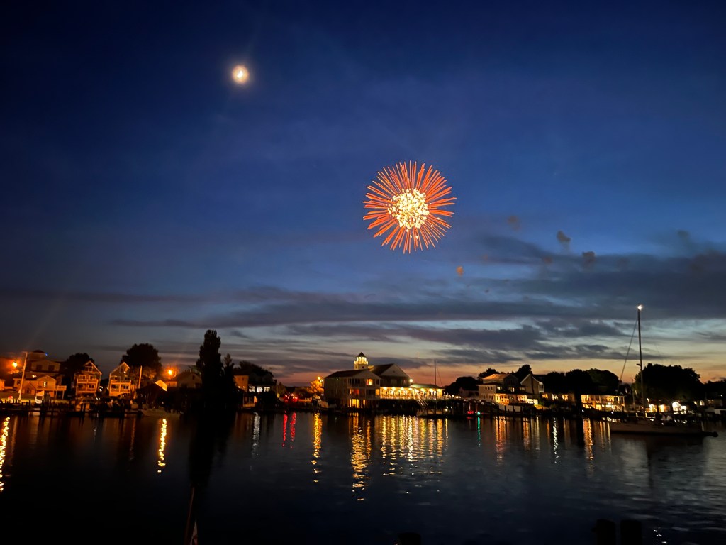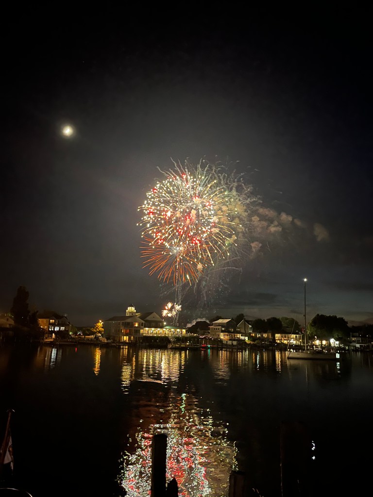 For dinner, we cooked burgers on the grill in our flybridge with Silver Linings and enjoyed their company. At dark, Solomons fireworks did not disappoint. Jen took some beautiful firework pictures. And of course we had our annual cherry pit spitting contest. The Silver Linings crew did great 🙂