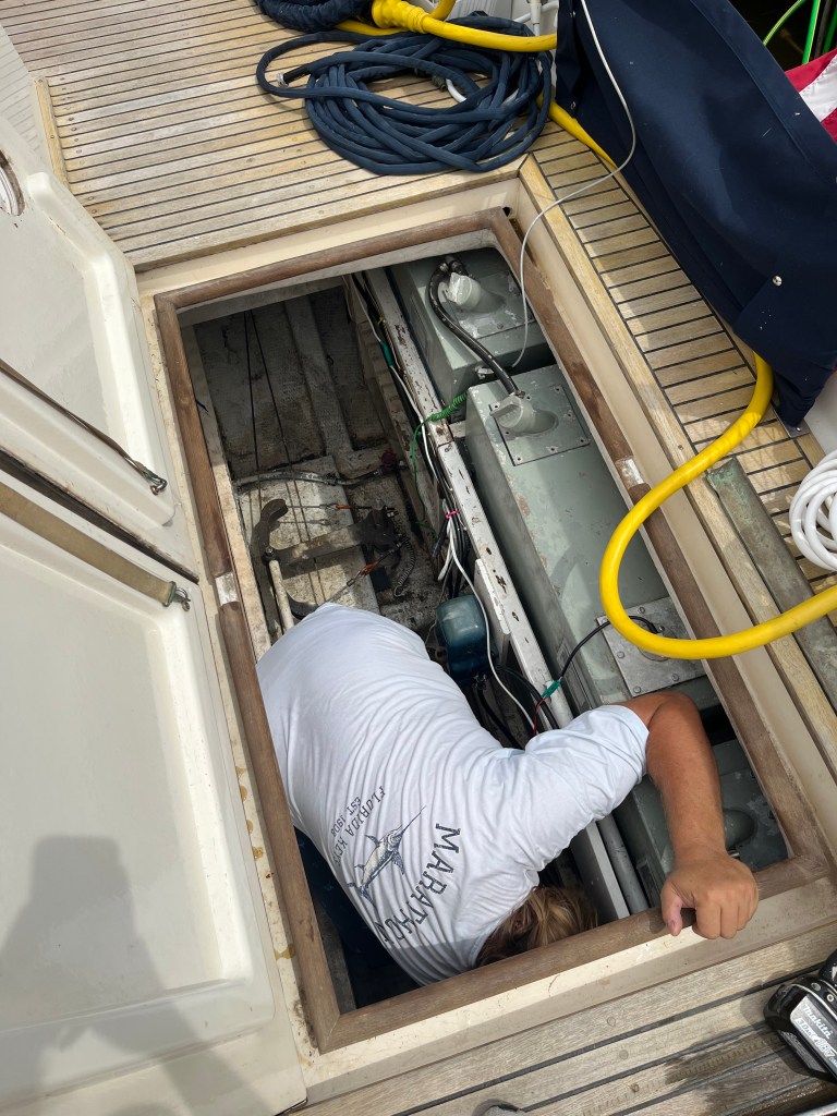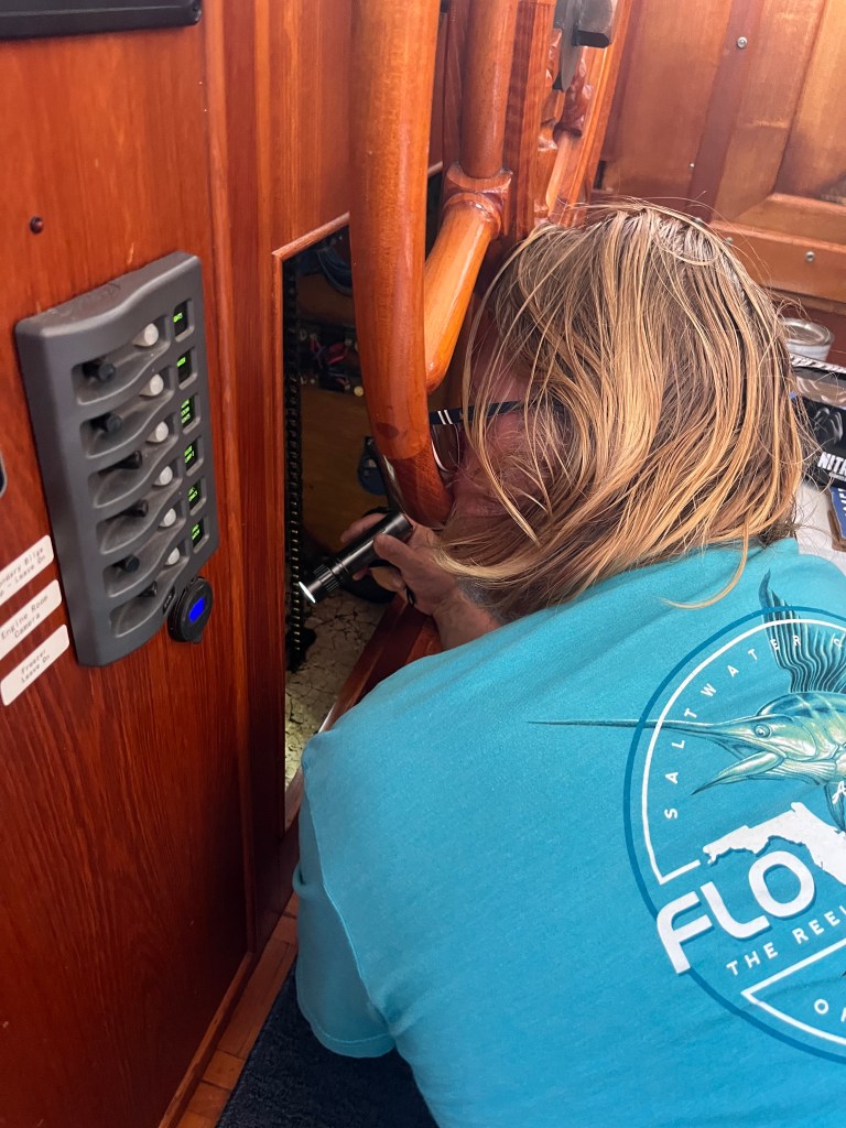 Mike and Jen did a few boat projects, including finding the leak for our fresh water tank. It was in the line for the fresh water wash down on the stern. While we had the stern storage compartment empty Jen cleaned it our and scrubbed it. It looks so clean now!