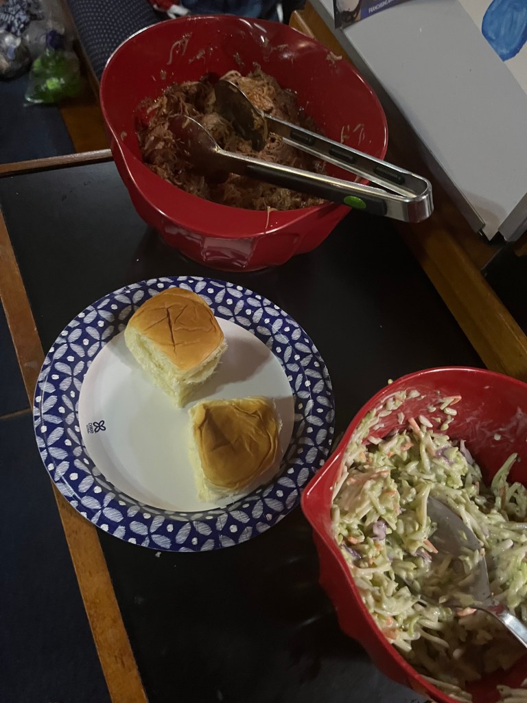 Jen made BBQ shredded chicken sliders with coleslaw for dinner. Yum!