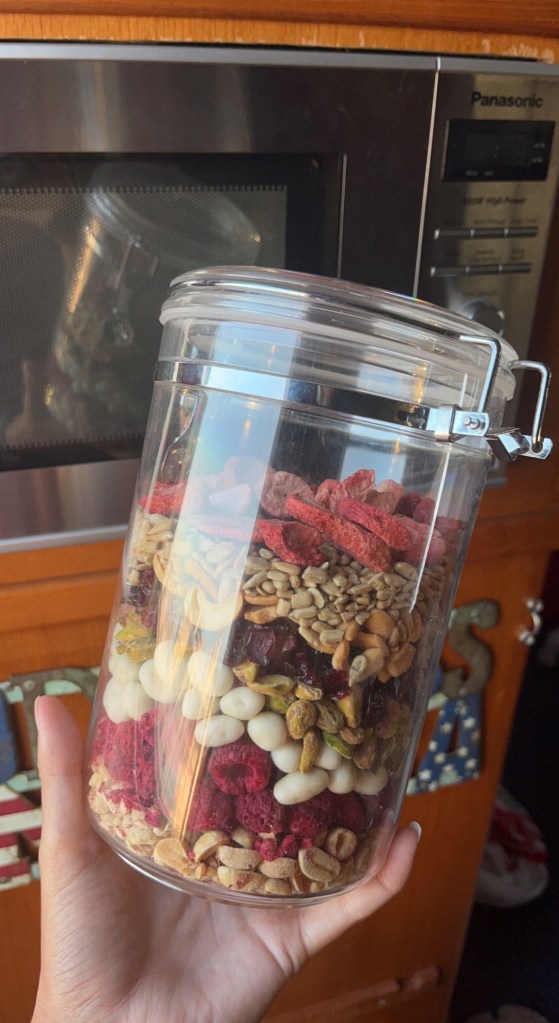 Jen and Kelly went ti target today. Jen made trial mix, with yummy freeze dried fruit and nuts.