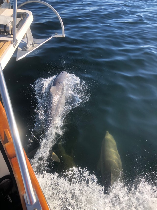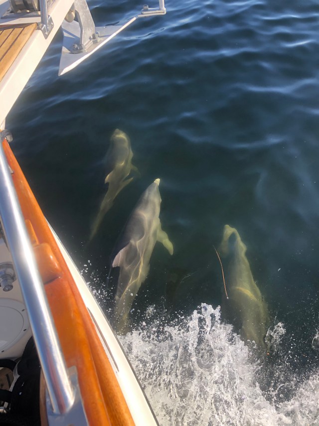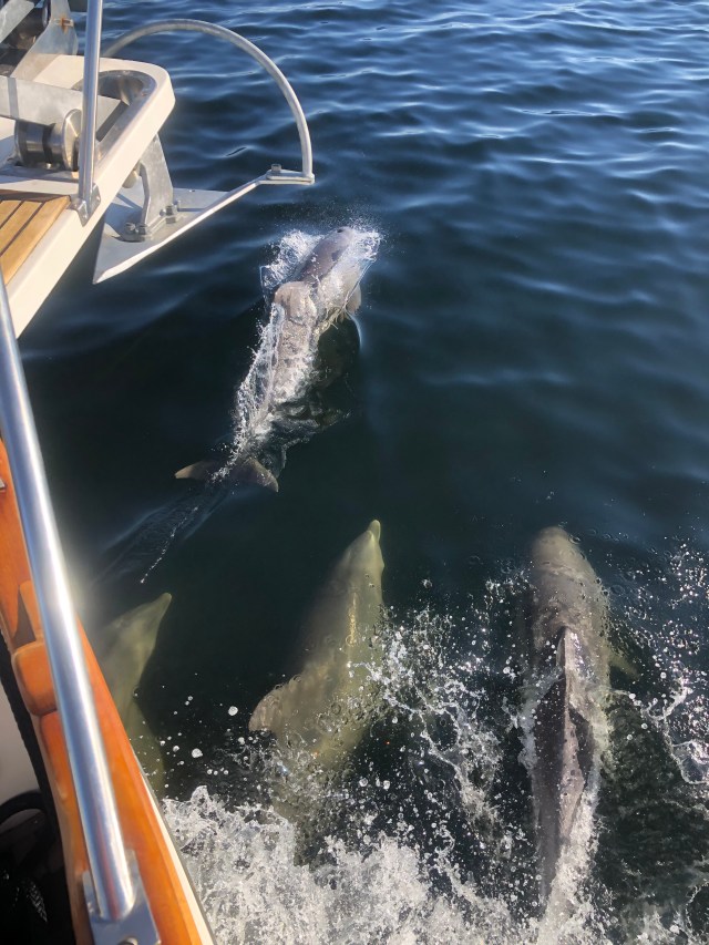 We LOVED Fort McRee, it was so beautiful. Listening and watching the planes go by was so much fun. But, it was time to move on to the next destination. Mike started the engines and Jen pulled up the anchor. Mike got us out on the anchorage, and started his work day. Today was the first day the girls drove the entire time. Jen took first shift, and did great. Then we let auto pilot take over for a while. It was the perfect day. Dolphins were splashing and playing in our wake and swimming with the boat in the front. At one point we had about 6 dolphins with us, it was amazing watching these majestic animals.