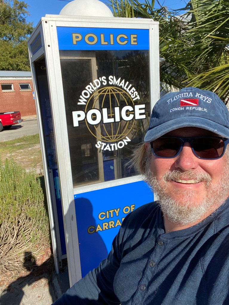 At lunch, Mike rode his bike to the bait shop in preparation of a chance to catch a fish while crossing. On the way, he stopped to take a selfie of the world’s smallest police station (see picture below).