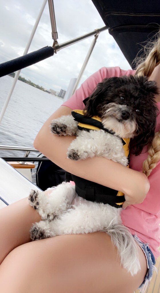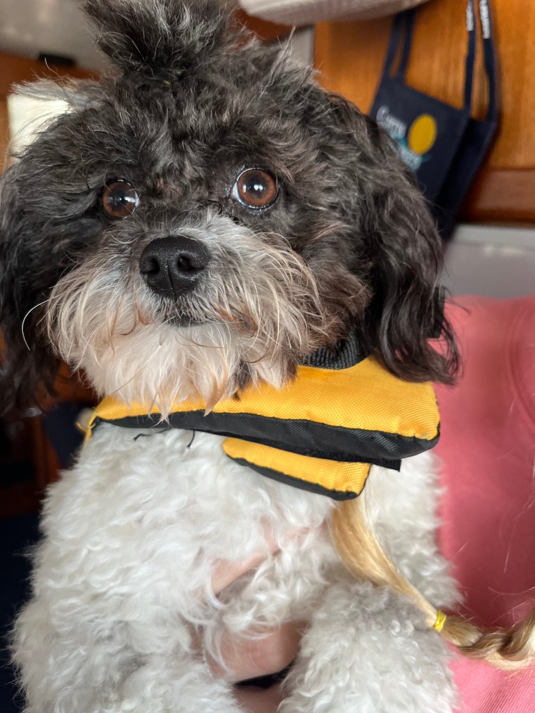 Today we said good bye to our friends at Legacy Harbor. Kelly did some last minute shopping at Publix, Jen batten down the hatches in case of rocky seas and Mike worked. At lunch time, Mike got us pulled out of the slip and Kelly drove us to Pink Shell Marina. It was a beautiful day. We put life jackets on the dogs and they rode up on the flybridge with us. They are becoming less nervous. Teddy and Bonnie slept while Harley slept with one eye open guarding the boat for Pirates.