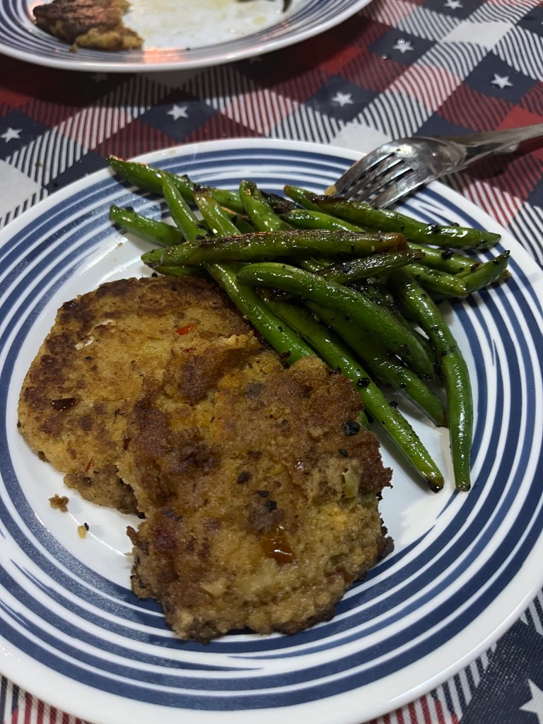 Jen made green beans and crab cakes for dinner.