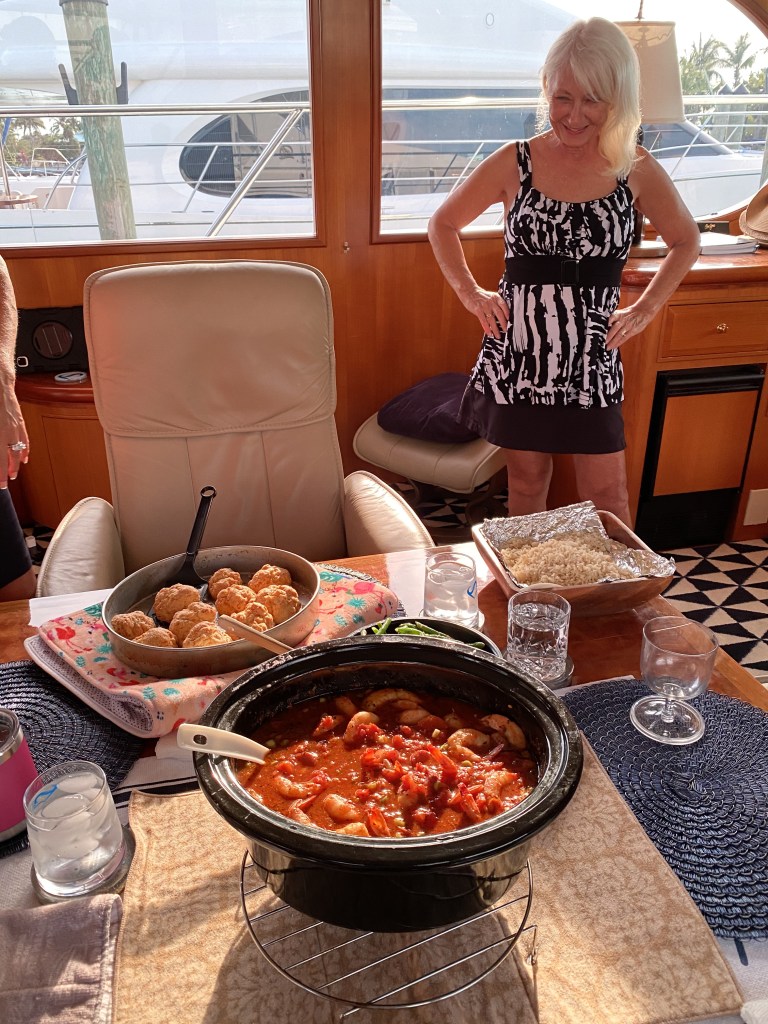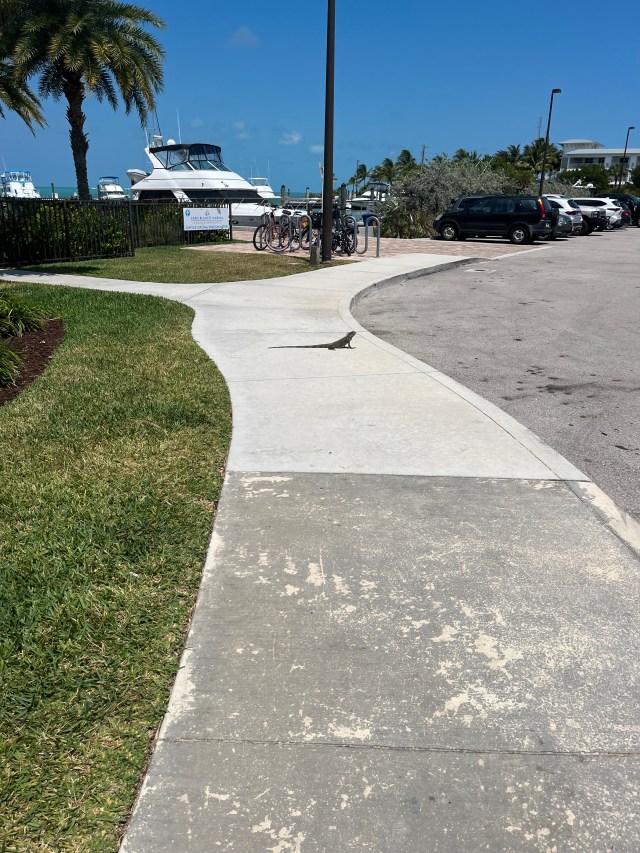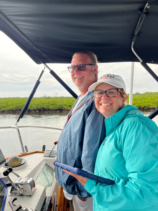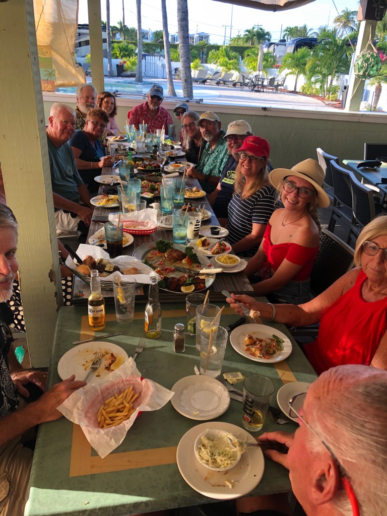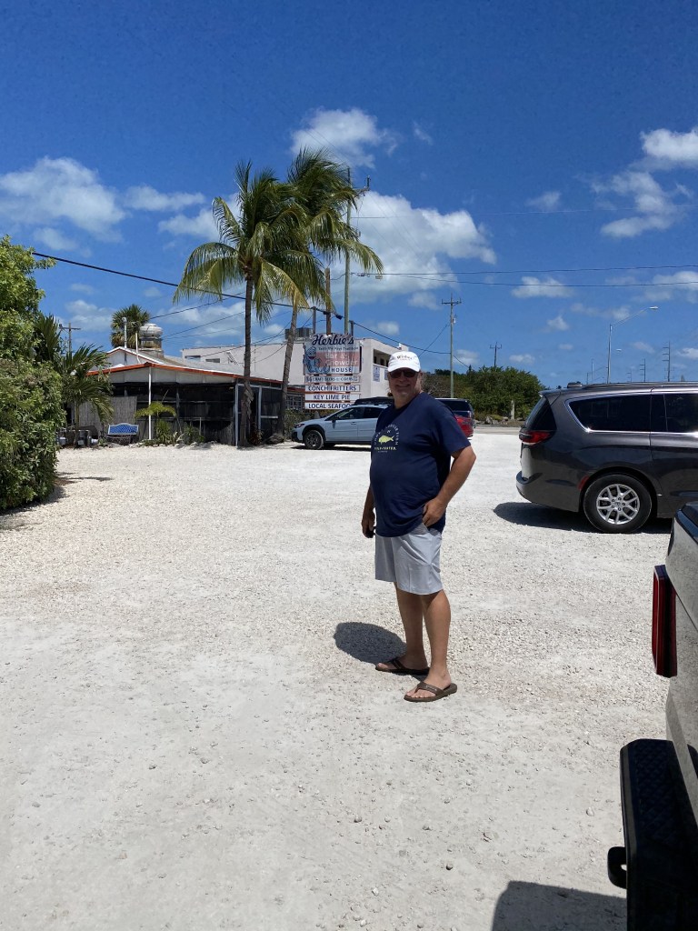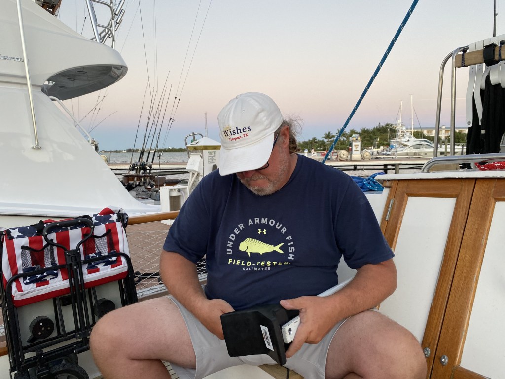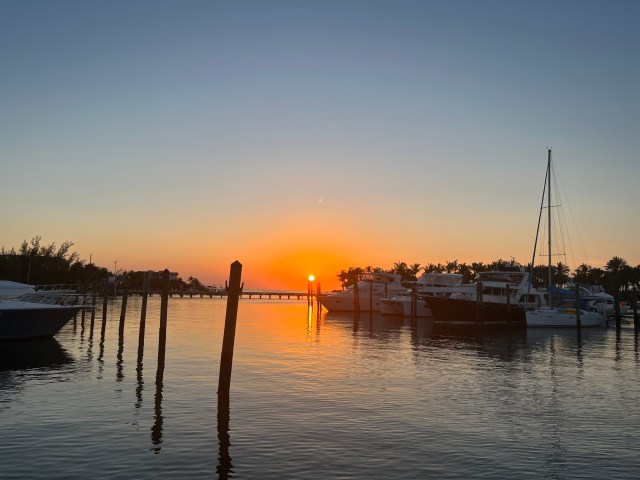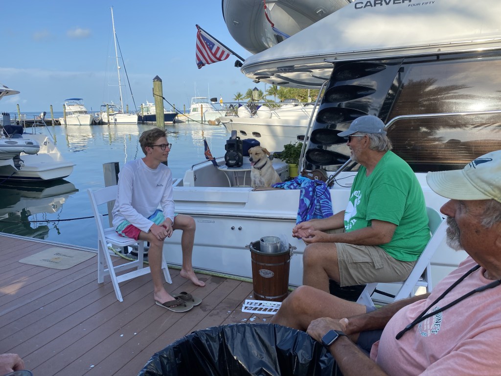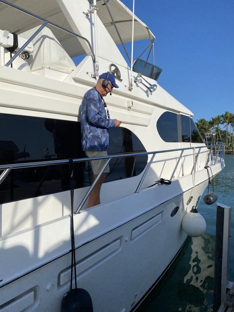 We left on Gulf side of the Keys and crossed under the #5 Channel Bridge and traveled on the Atlantic side. Just passed the Keys, we turned into the Card Sound. Weather was great in Marathon but it started to rain when we got close to our destination. The trip along the inter coastal from the Atlantic was a bit concerning. Our charts were showing shallow water on both sides of us and we had to carefully stay in a narrow channel….while in the rain. Our boat has a 4.5 foot draft. That means our boat is 4.5 feet below the water surface any water depths less than 7 feet can be stressful. We took it very slow just in case we ran aground – only go as fast as you are willing to hit something.