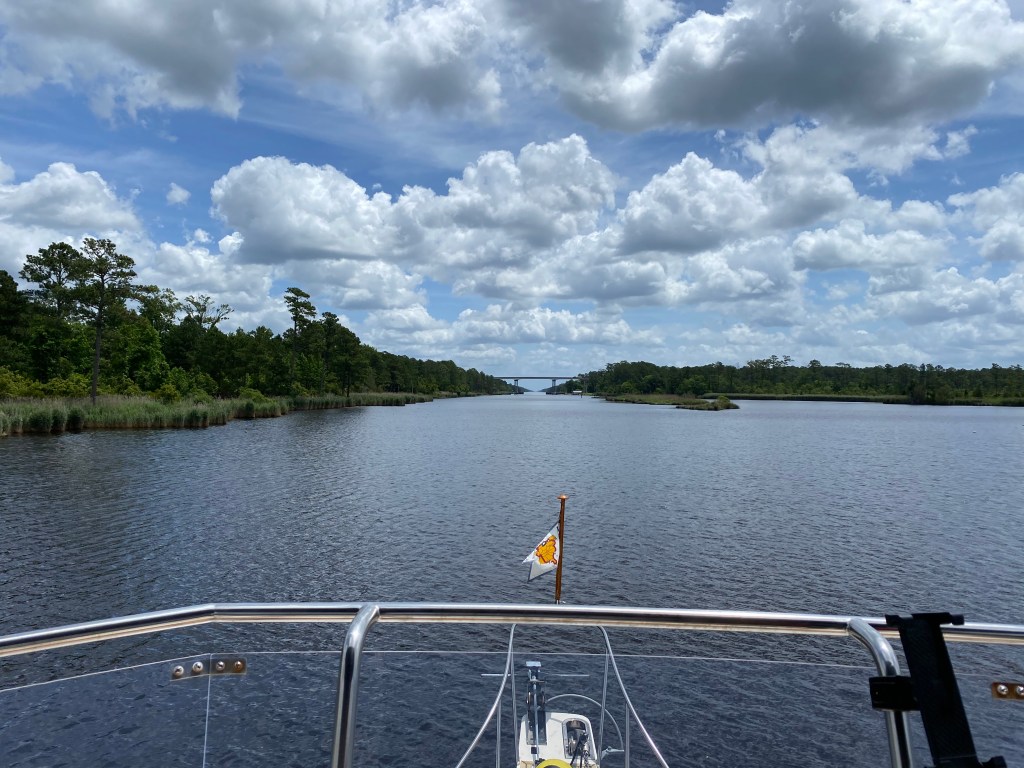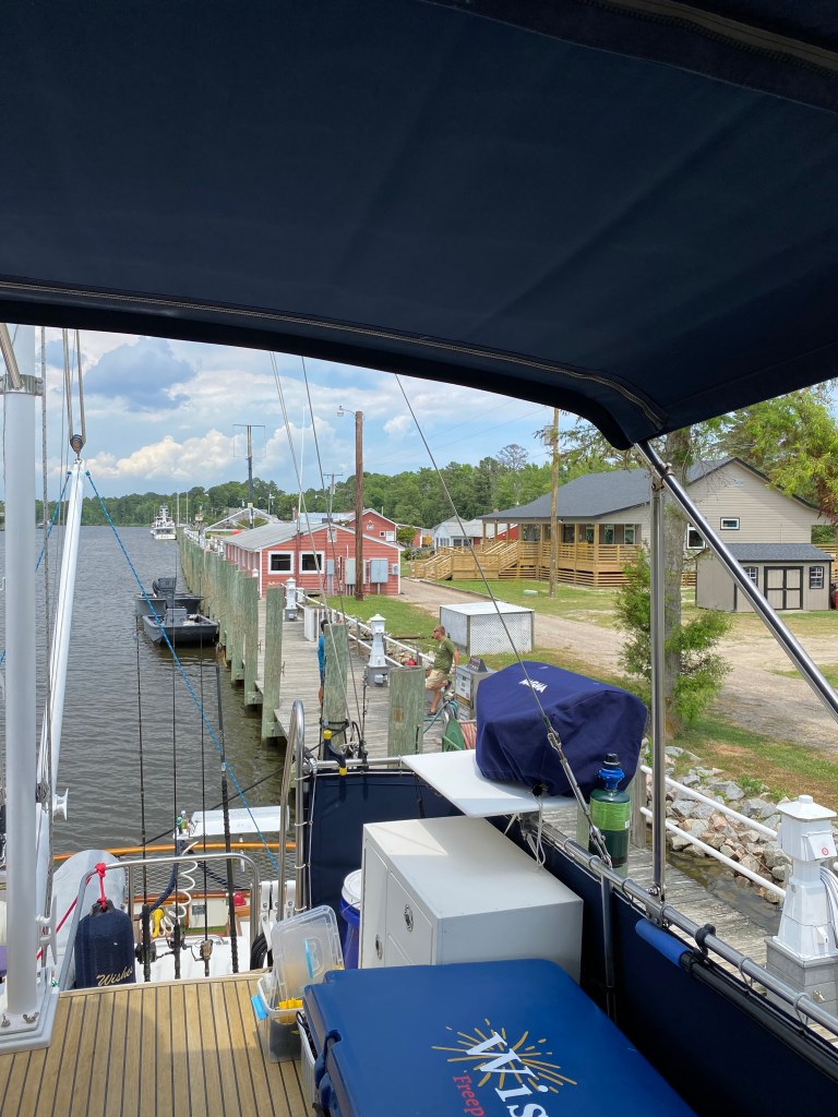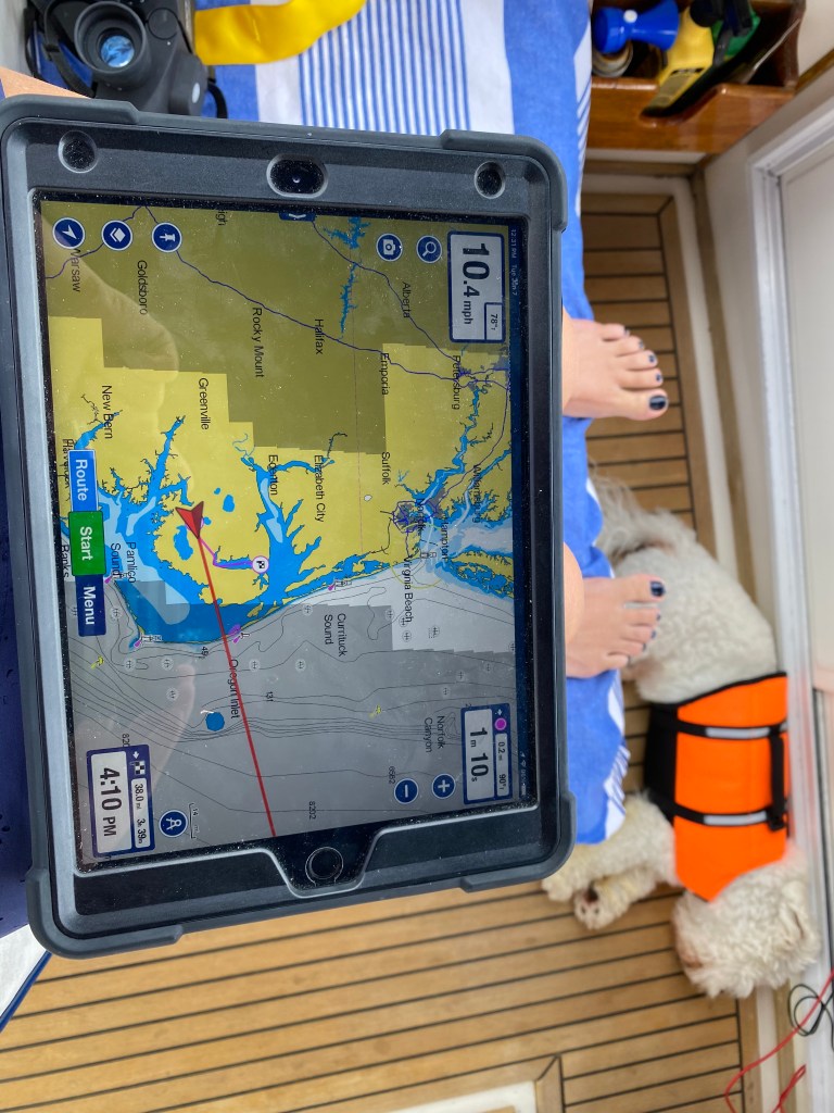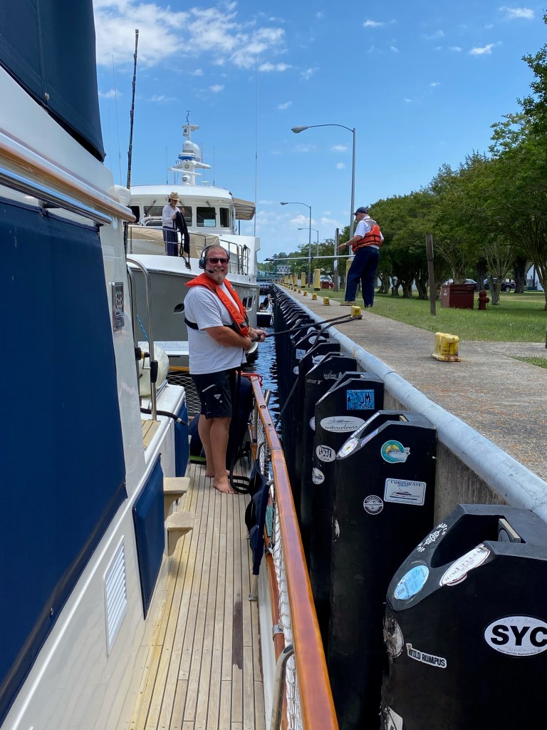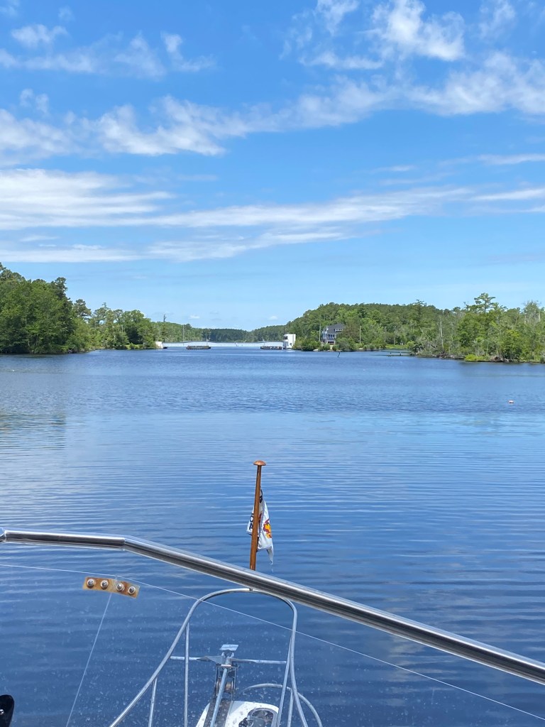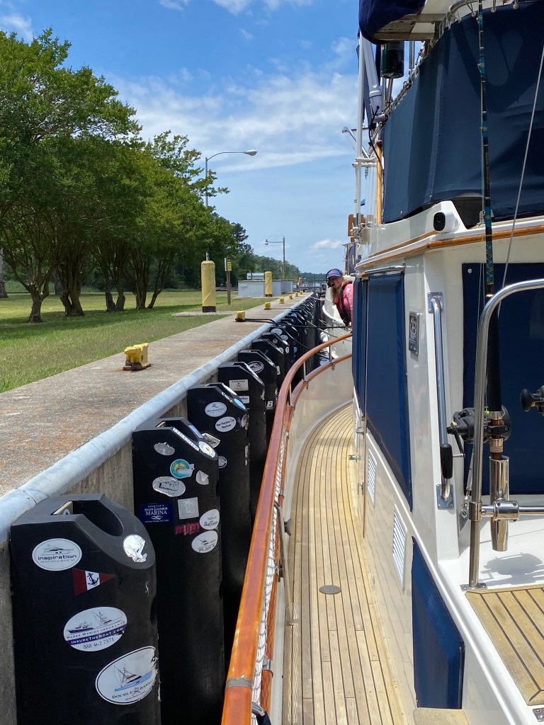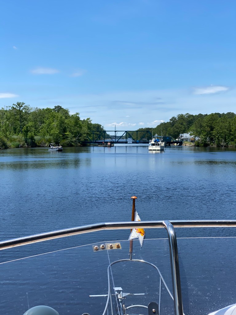 The Great Bridge Lock was a new experience. We watched videos last night and it looked easy. As we approached the lock, we caught up another boat that had experience with the lock. The Lockmaster heard the 3 of us boats discussing the process and joined the conversation. He gave us confidence by telling us our plan was correct. We really did not need to stress over it. It was fun and easy.