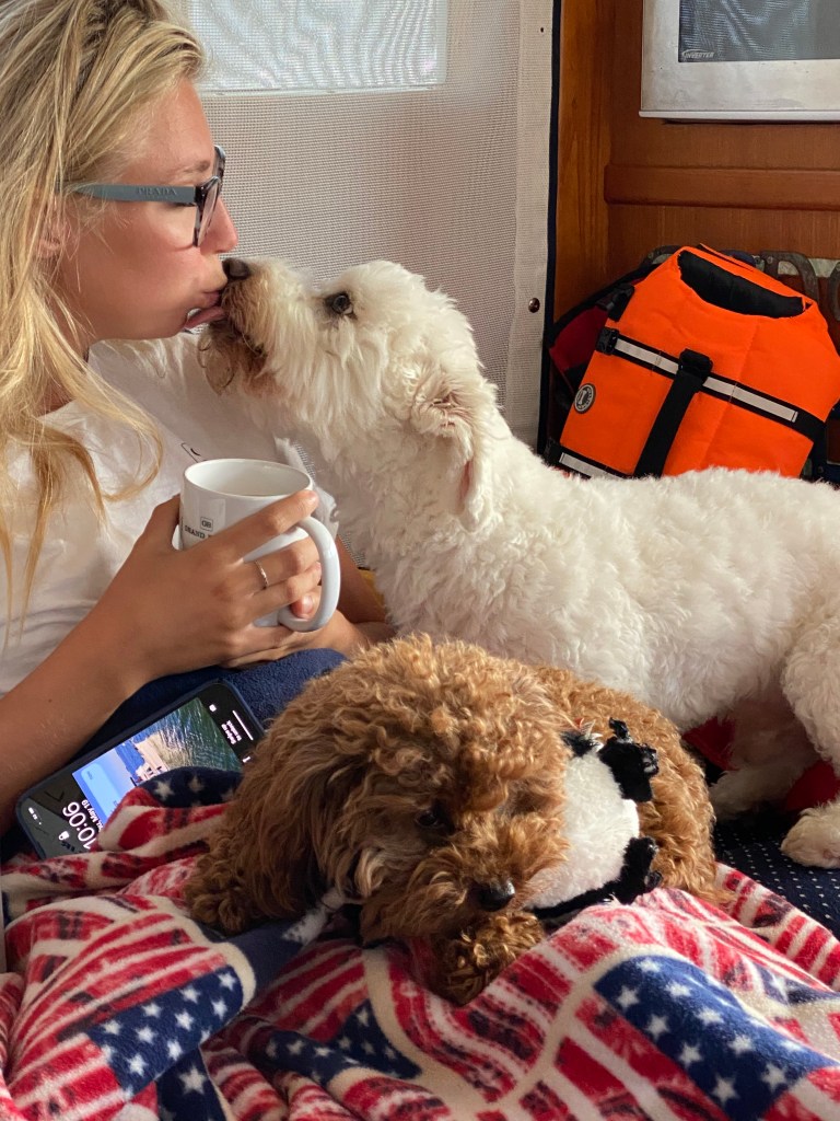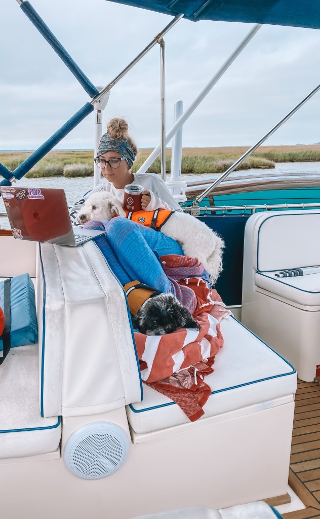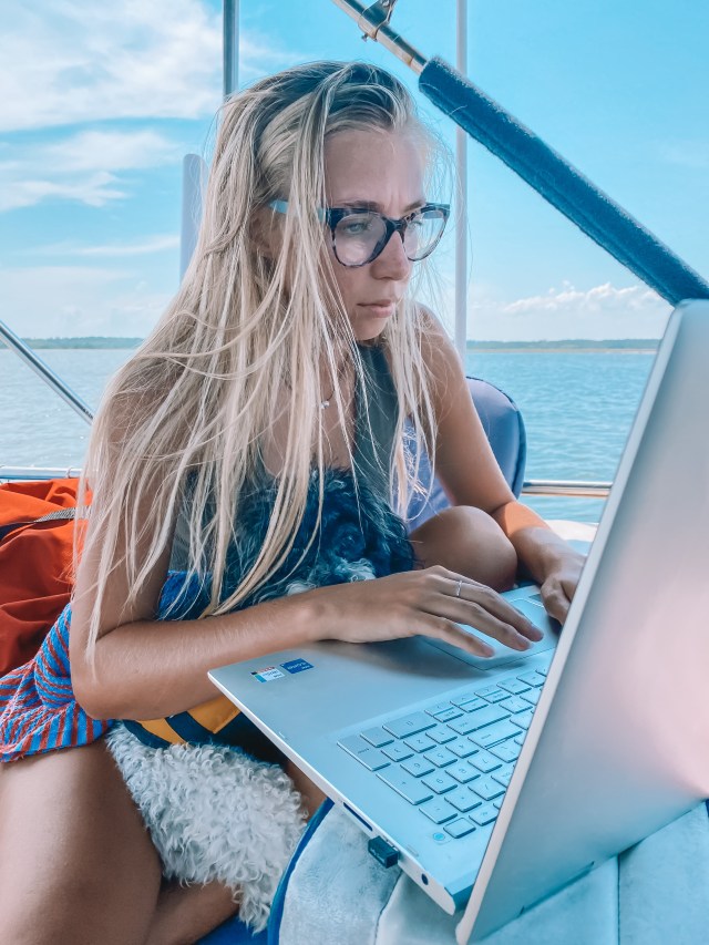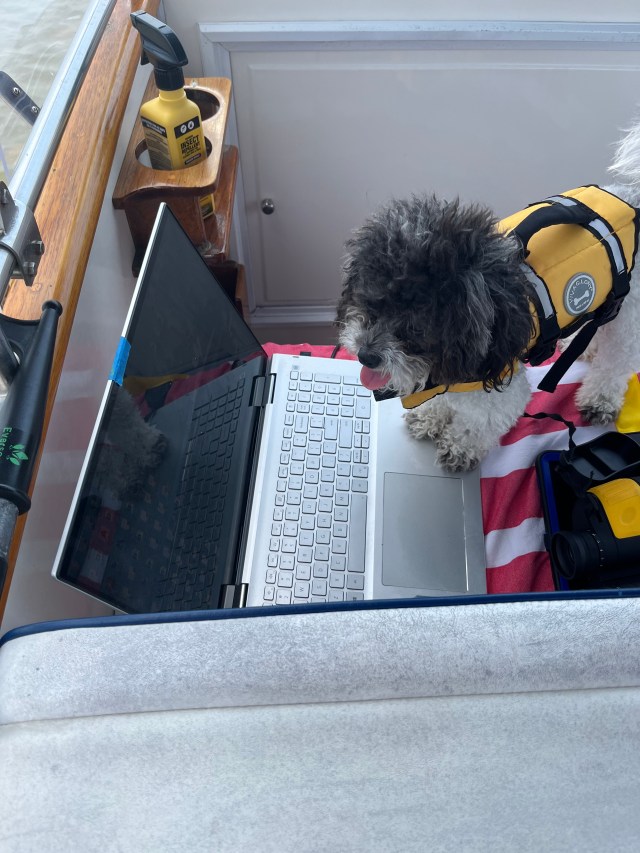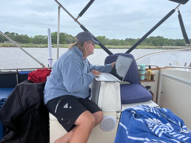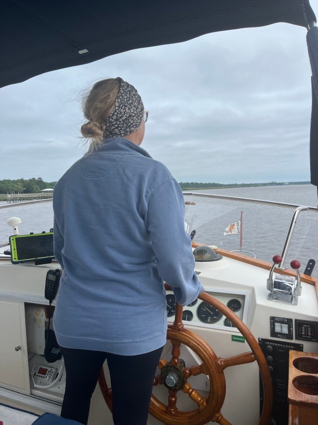 Kelly drove while Mike worked and Jen did blog posts. Kelly prefers to help plan and navigate. She drives when the water is easy and calm.