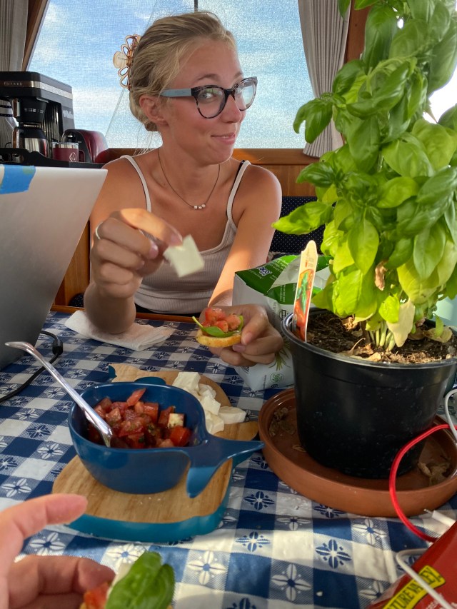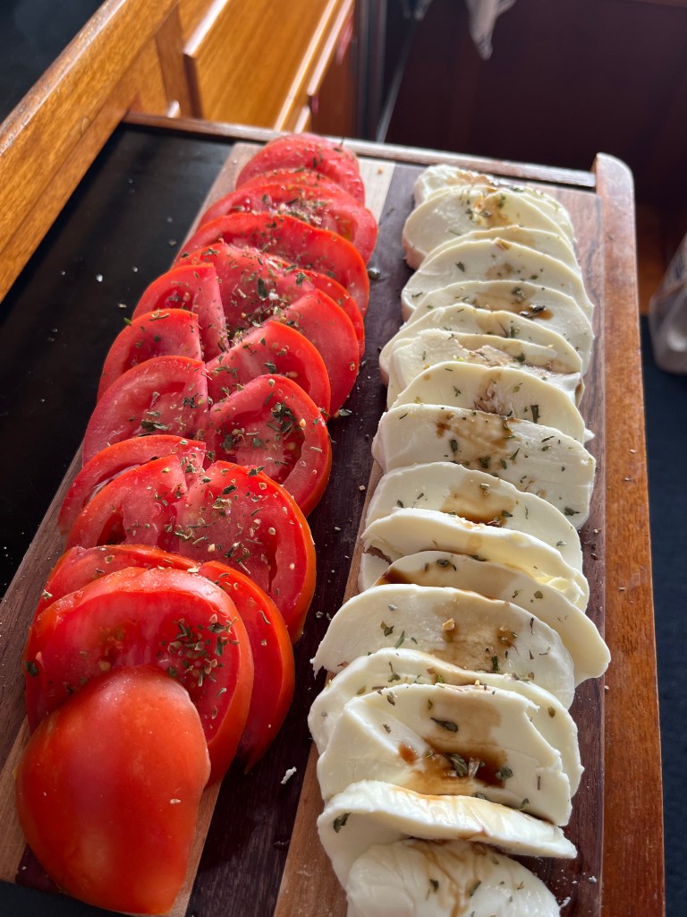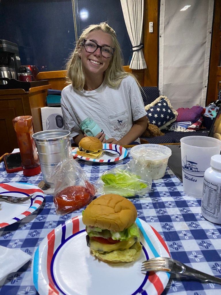 At 4 pm, we arrived at our anchorage – Church Creek Anchorage , mile marker 488. Jen made some bruschetta and we had leftover hamburgers for dinner from last night.