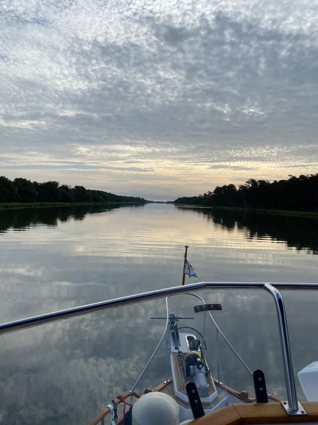 At 7:00 am, started our engines and we pushed off from the dock. The calm waters made for great sleeping but tricky to pull away from the dock. We were parallel parked and turning out is a challenge to avoid hitting our swim platform on the dock. Kelly used a pole to push us from the stern while Mike turned us out.