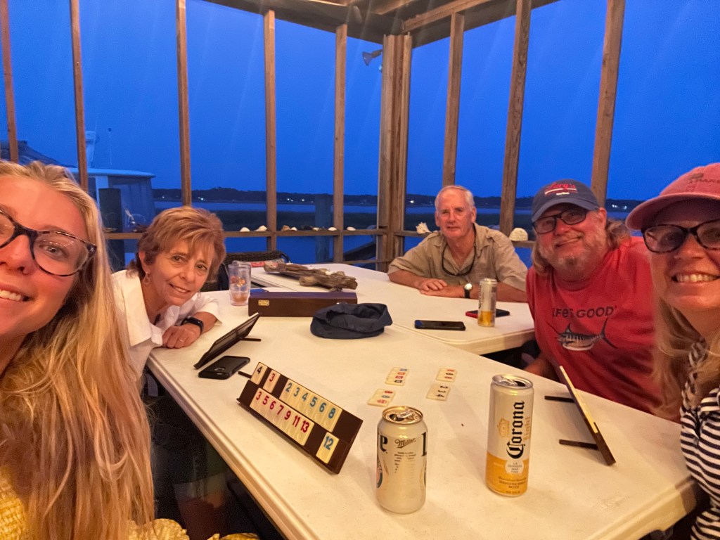 Jen and Kelly finished some last minute shopping in town before Mike finished work. We spent the evening at Marcia and Steve’s boat dock. It is a cute enclosed “porch” with a kitchen, bathroom and breezy living area. Steve made fantastic burgers and we spent the evening chatting and playing games. We are so fortunate to have friends like them. We love you Steve and Marcia!!