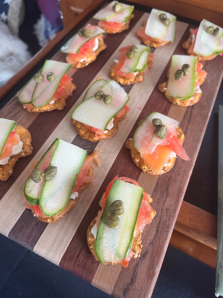 Because of weather concerns, we got a late start. Jen made a light breakfast…crackers, smoked salmon, cucumbers, tomato cream cheese and capers. It was a refreshing breakfast. At noon, we pulled up the anchor and headed for Charleston. It was a short 4 hour travel day.