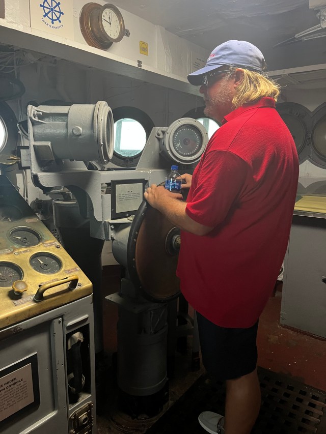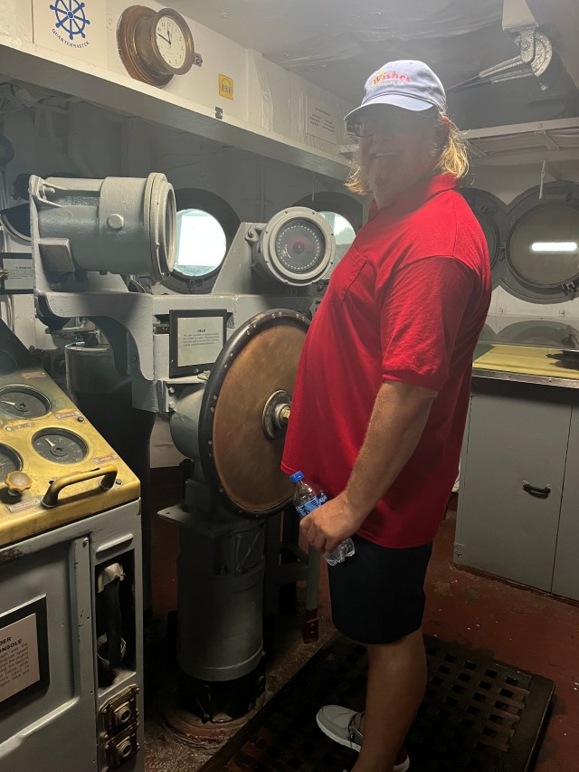 We spent about 3 hours touring the ship. It was a like small city. They thought of everything, including a dentist, eye doctor, laundry/pressing….even a jail! The stairs (and there are a lot of them) were narrow and steep. We tried to imagine what it was like for soldiers to quickly move about the ship.